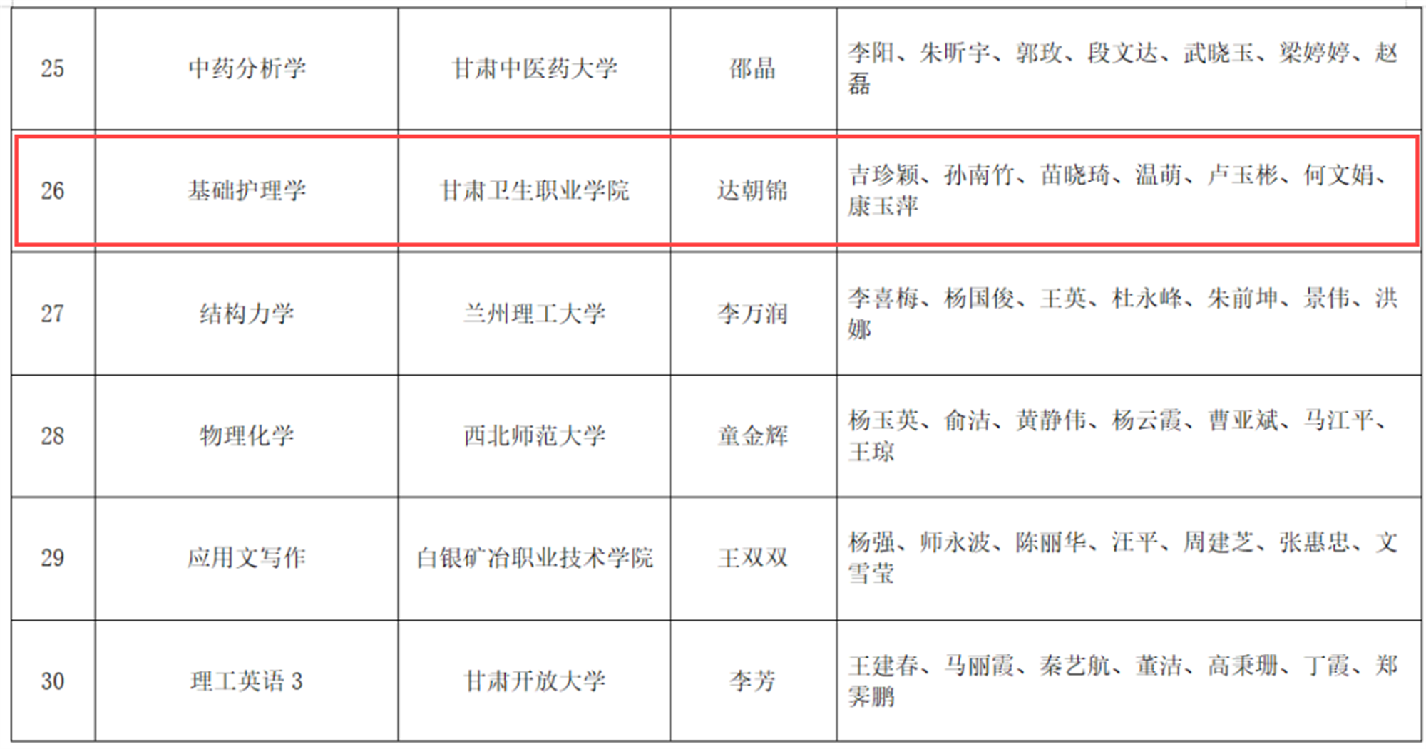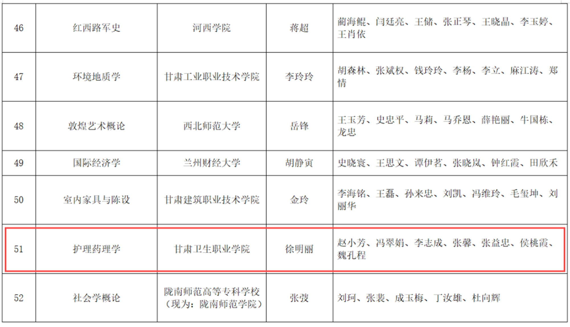 近日,甘肃省教育厅印发《关于公布第二批甘肃省高校课程思政示范项目名单的通知》(甘教高函〔2024〕16 号),365英国上市集团官网推荐申报的药学和助产2个专业均获批甘肃省课程思政示范专业,由达朝锦老师领衔的《基础护理学》和徐明丽老师领衔的《护理药理学》2门课程及其教学团队分别获批甘肃省课程思政示范课程、教学名师和团队。