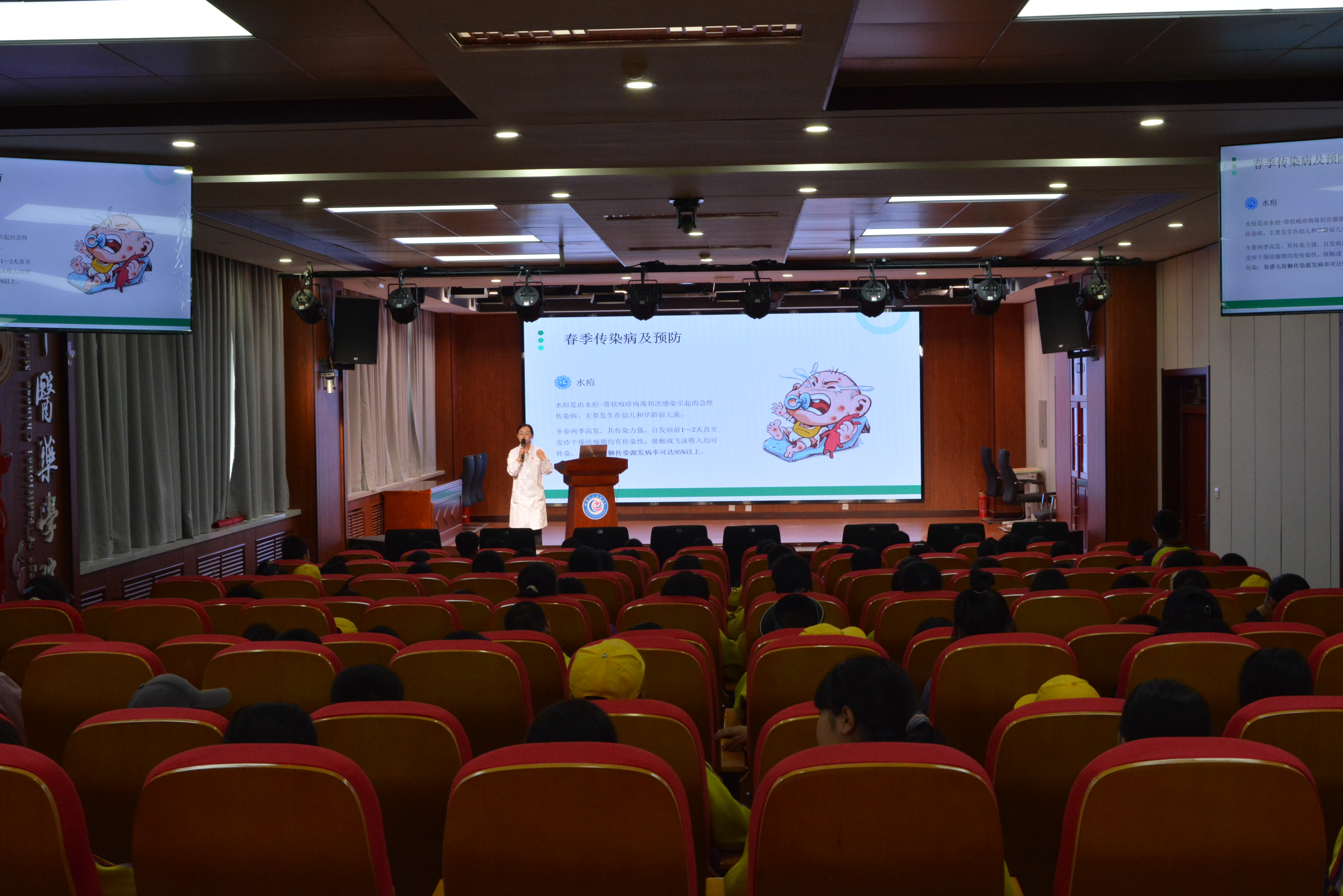 随后,药学院党总支副书记李晶给小学生们带来了一场以“春季常见流行病及预防”为题的小讲座。讲座中,李晶书记结合春季气候变化特点,围绕流感、水痘、诺如病毒等常见流行病,从致病原因、典型症状、传播途径和预防措施等方面进行详细讲解。她用生动易懂的语言提醒同学们:“春季细菌病毒活跃,要注意勤洗手、多通风、注意饮食和卫生,避免去人群密集场所,按时接种疫苗。”