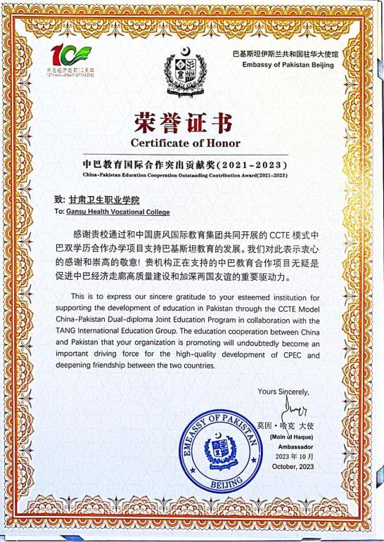 被巴基斯坦大使馆评为授予“中巴教育国际交流突出贡献奖”。