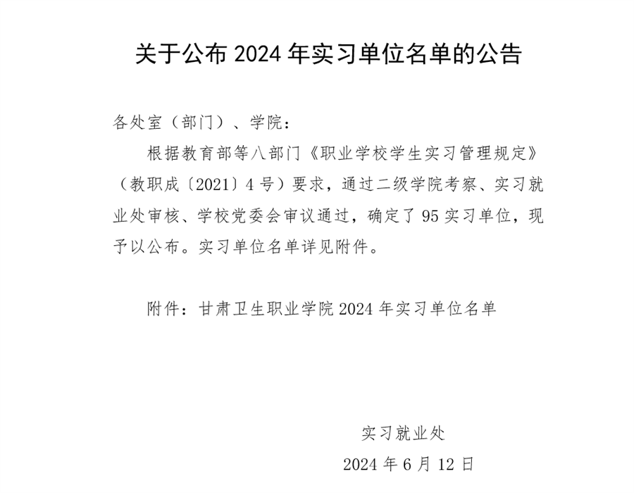 关于公布2024年实习单位名单的公告