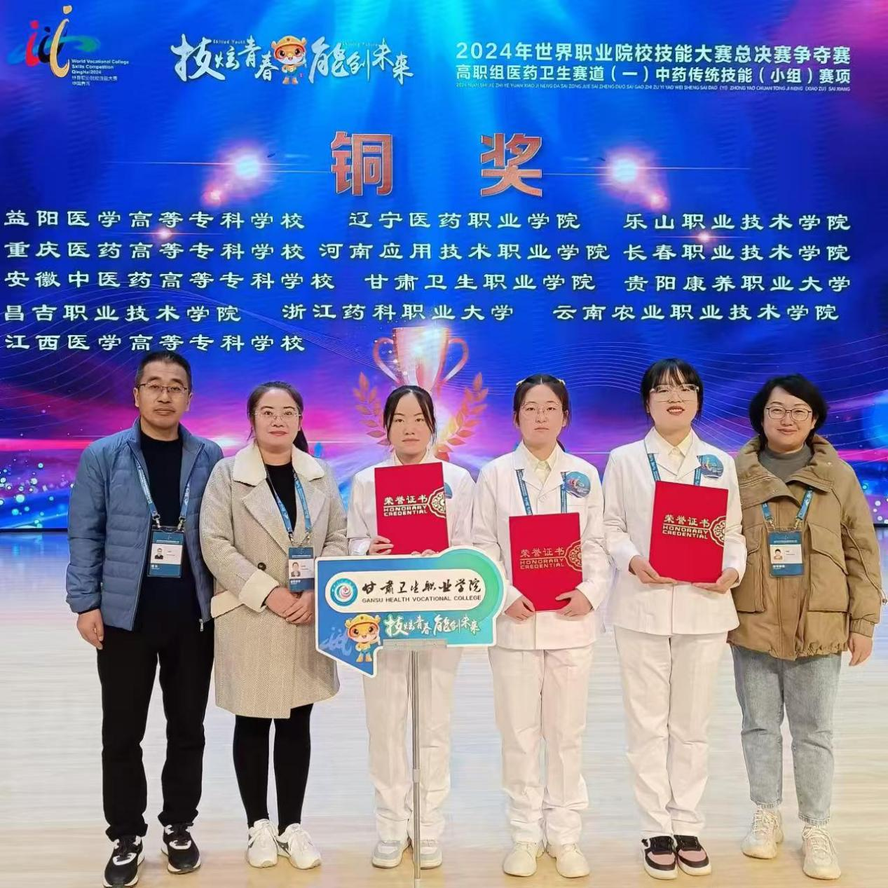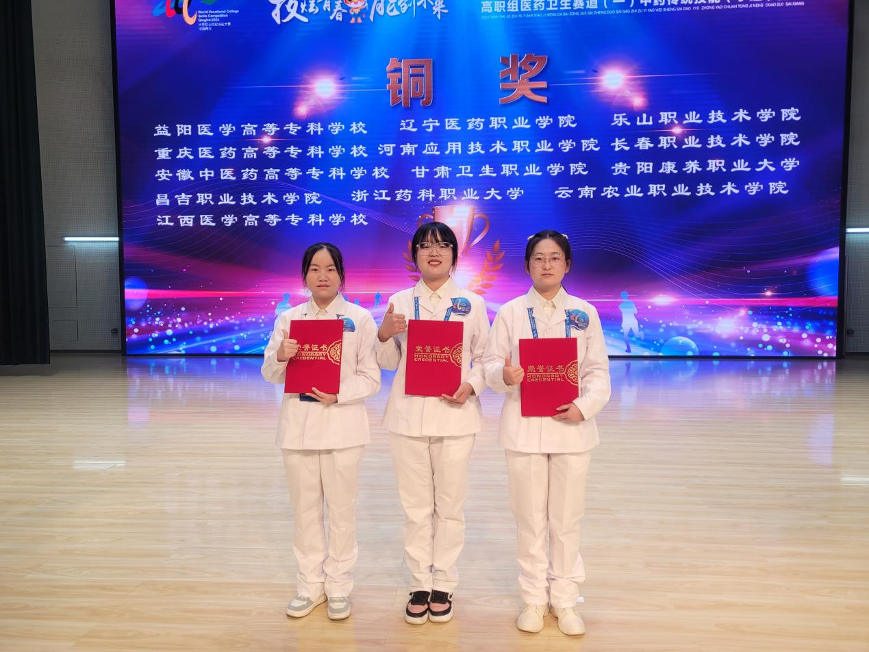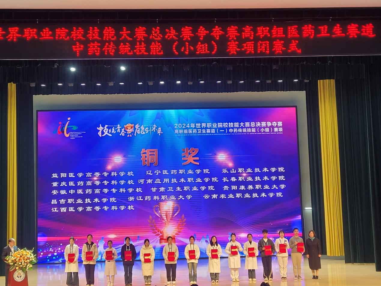 10月28日至11月1日,2024年世界职业院校技能大赛总决赛医药卫生赛道一(中药传统技能赛项)争夺赛在青海卫生职业技术学院成功举办。来自全国各地的55支优秀参赛队,共190名参赛选手同台竞技。365英国上市集团官网药学院选派由陈方圆、宋爽老师指导的丁芳、贾敏、肖晓童团队参赛,以平行组第3名的成绩荣获铜奖。