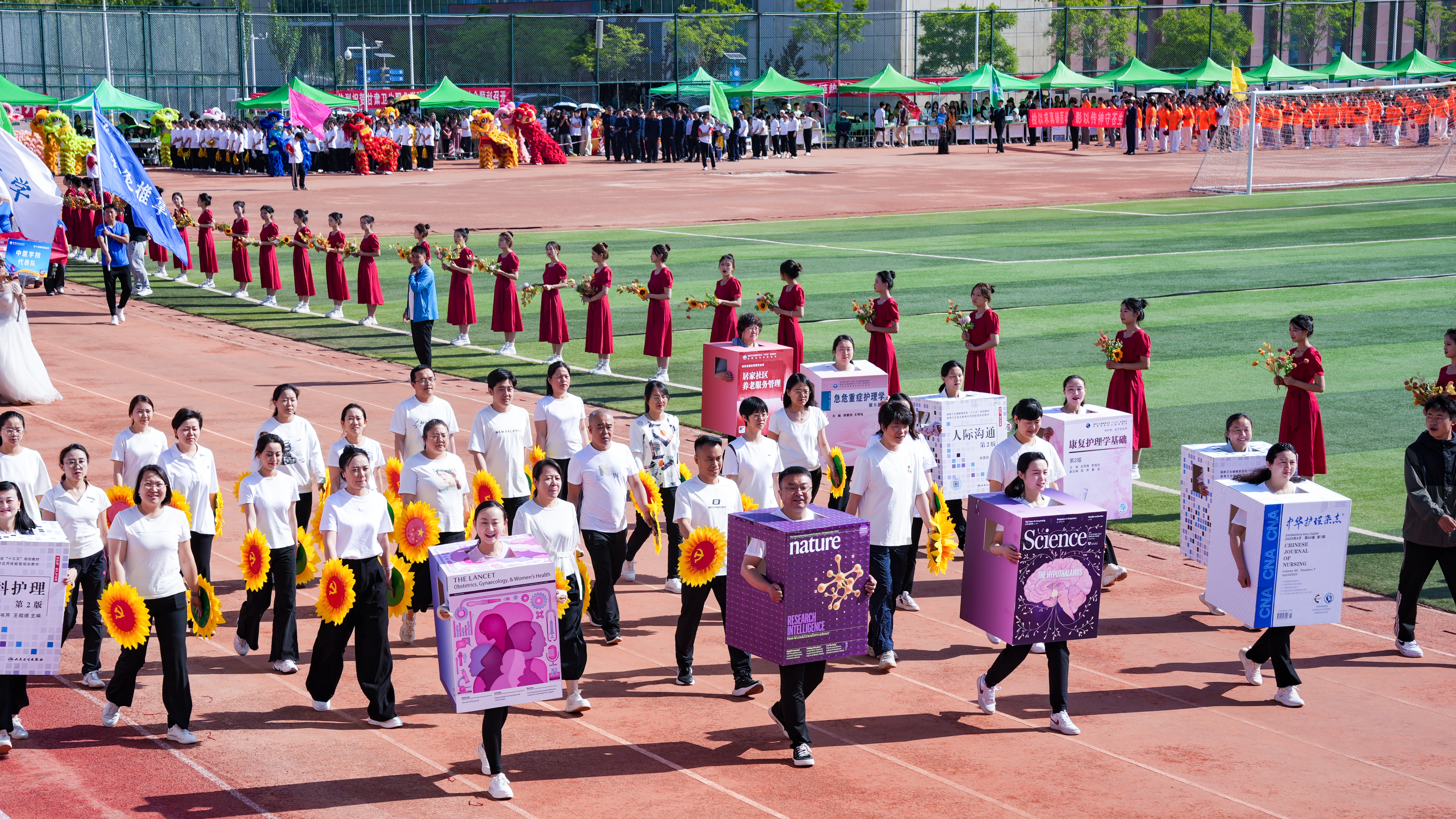 伴随着激动人心的进行曲,国旗、校旗、校徽、口号(文明、健康、团结、奋进)、彩旗队、花束队、裁判员代表队、各专业运动员代表队方阵依次入场。各方阵队伍步伐矫健、口号嘹亮,各专业和学生社团结合自身特色,精心设计了独特的过场表演,有的身着专业服装展示医护人员的风采,有的高举院训横幅表达医学生救死扶伤的郑重承诺,有的用响亮的口号传递着青春的激情,充分展现了同学们的意气风发与创新精神。由食堂厨师、物业工作者、校园超市员工组成的勤笃公司(服务保障)方队首次亮相运动会,展现了默默守护校园的后勤人团结奋进的别样风采。