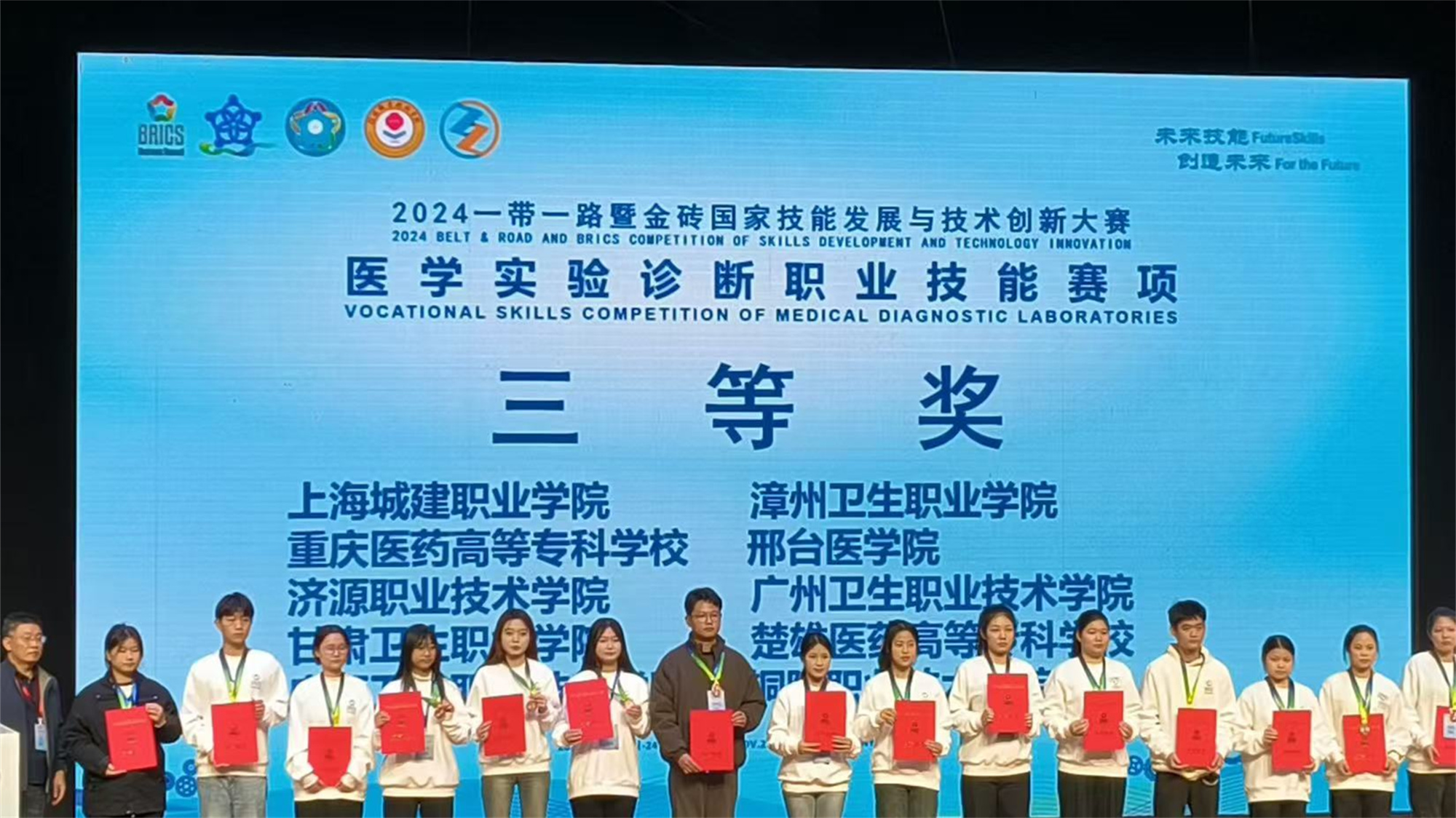 11月21日至24日,“2024一带一路暨金砖国家技能发展与技术创新大赛”首届医学实验诊断职业技能赛项在信阳职业技术学院举办,来自全国各地26个省市区的60所本专科院校的代表队参赛。365英国上市集团官网医学技术与工程学院医学检验技术专业牛爱爱、陈倩倩2名参赛选手凭借扎实的专业知识与精湛的技能操作,荣获三等奖。