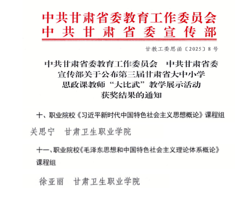 近日,由中共甘肃省委宣传部、中共甘肃省委教育工作委员会联合主办的第三届甘肃省大中小学思政课教师“大比武”教学展示活动公布了获奖名单。马克思主义学院教师喜获三等奖2项,实现该赛事获奖数量新的突破。其中关思宁老师在职业院校《习近平新时代中国特色社会主义思想概论》课程组荣获三等奖,徐亚丽老师在职业院校《毛泽东思想和中国特色社会主义理论体系概论》课程组荣获三等奖。