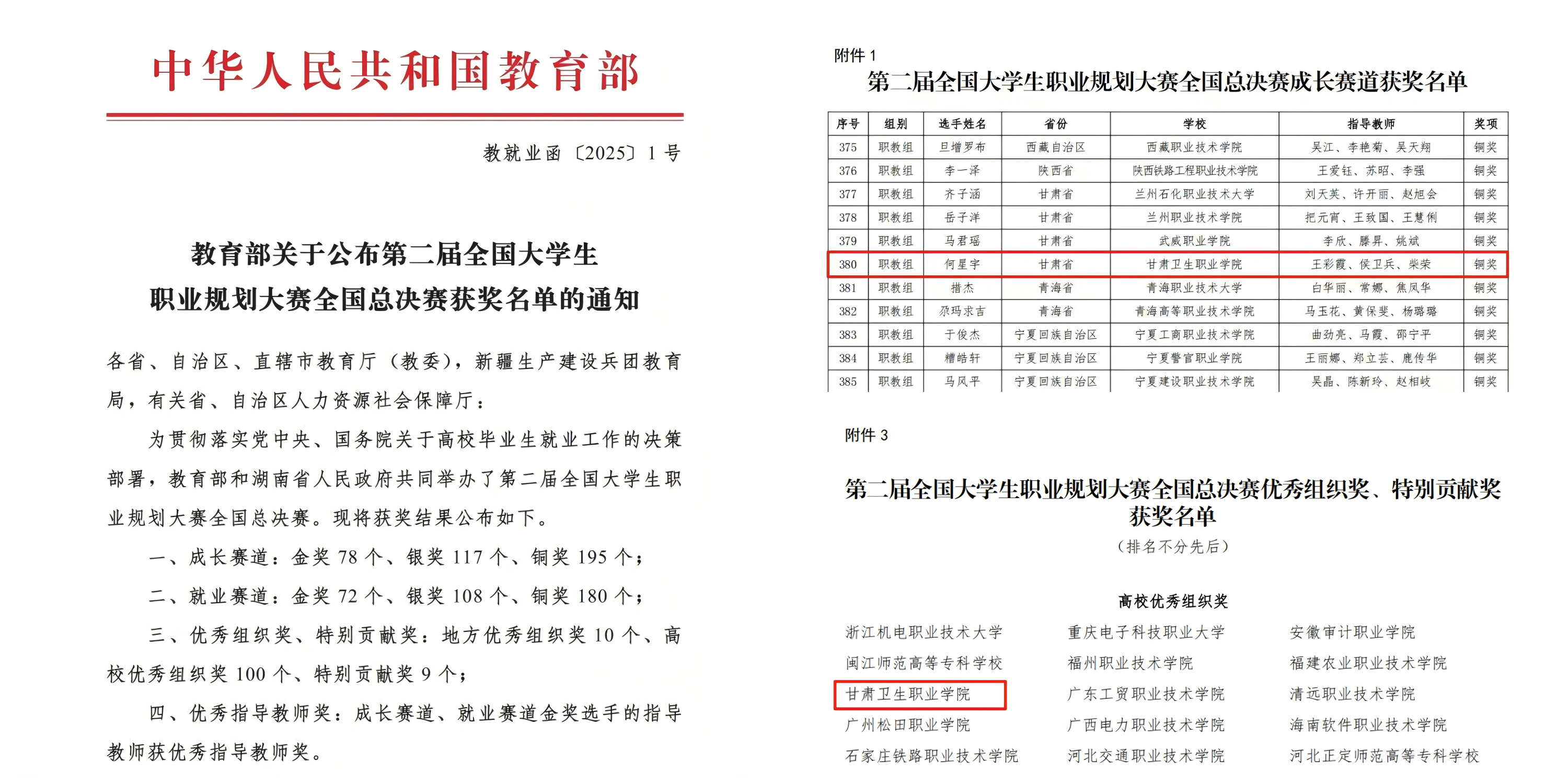 近日,教育部正式公布第二届全国大学生职业规划大赛全国总决赛获奖名单,365英国上市集团官网中医学院2023级针灸推拿专业学生何星宇荣获成长赛道(职教组)全国铜奖,学校获评全国“高校优秀组织奖”,是本届大赛中甘肃省唯一获此奖的高校。“双奖”的获得,实现了学校在此类国家级赛事中的奖项荣誉的历史性突破。