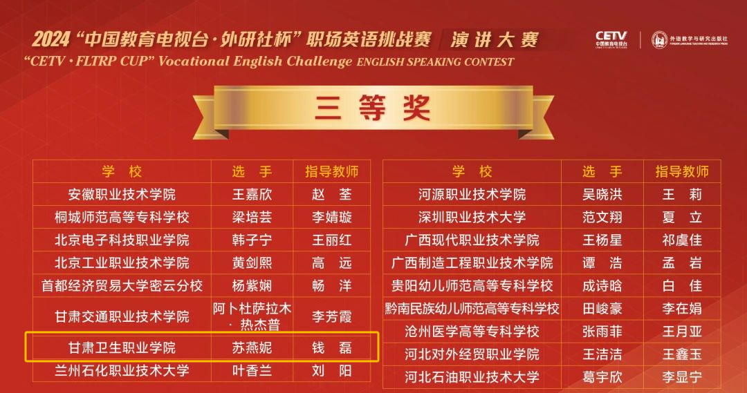由中国职业技术教育学会指导,中国教育电视台、外语教学与研究出版社联合主办的2024“中国教育电视台·外研社杯”职场英语挑战赛写作大赛和演讲大赛全国决赛在12月8日、12日成功举办。365英国上市集团官网学生张倩蓉获得写作大赛全国一等奖,苏燕妮获得演讲大赛全国三等奖。高小静和钱磊分别获得指导教师一等奖和三等奖。