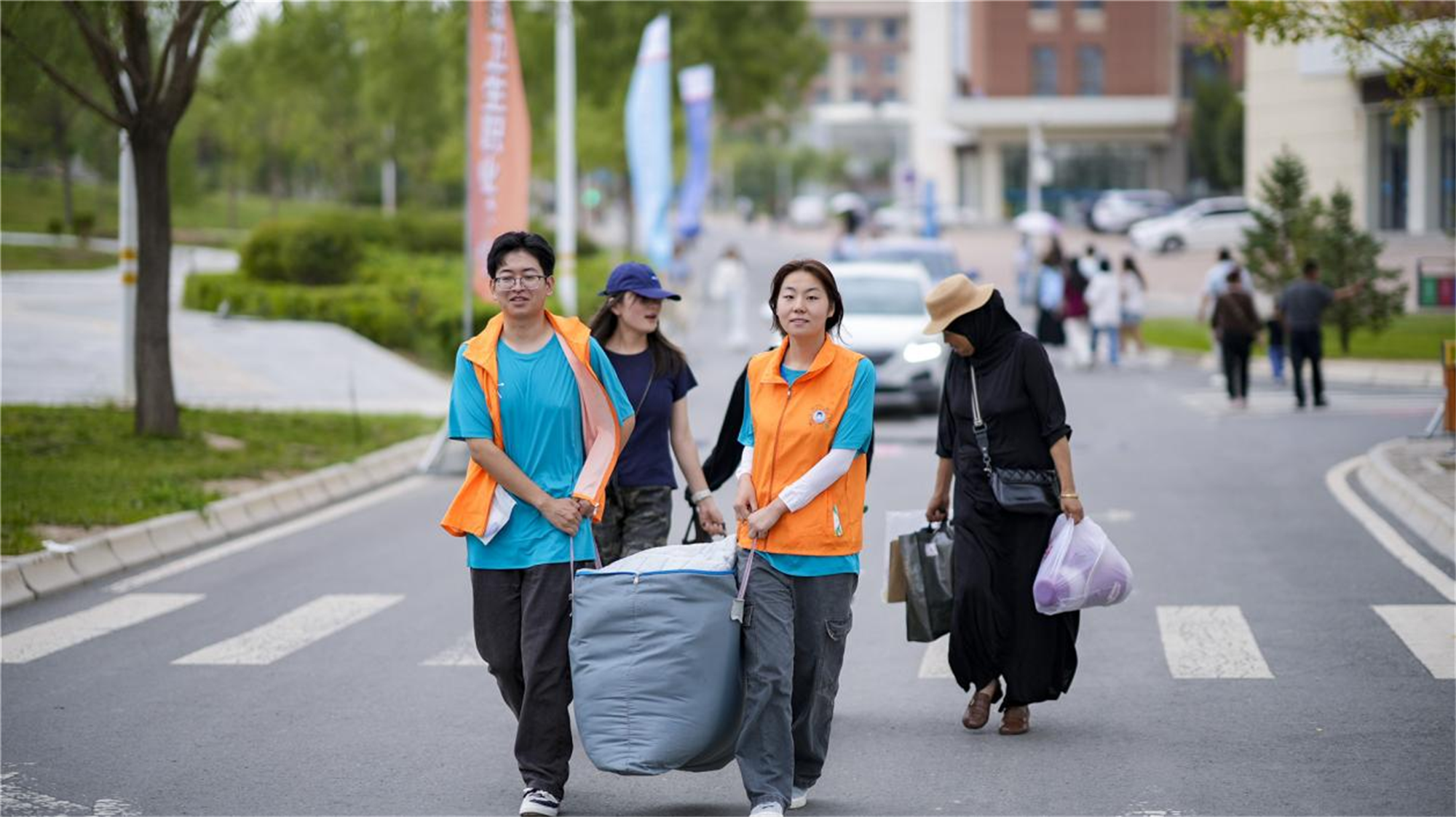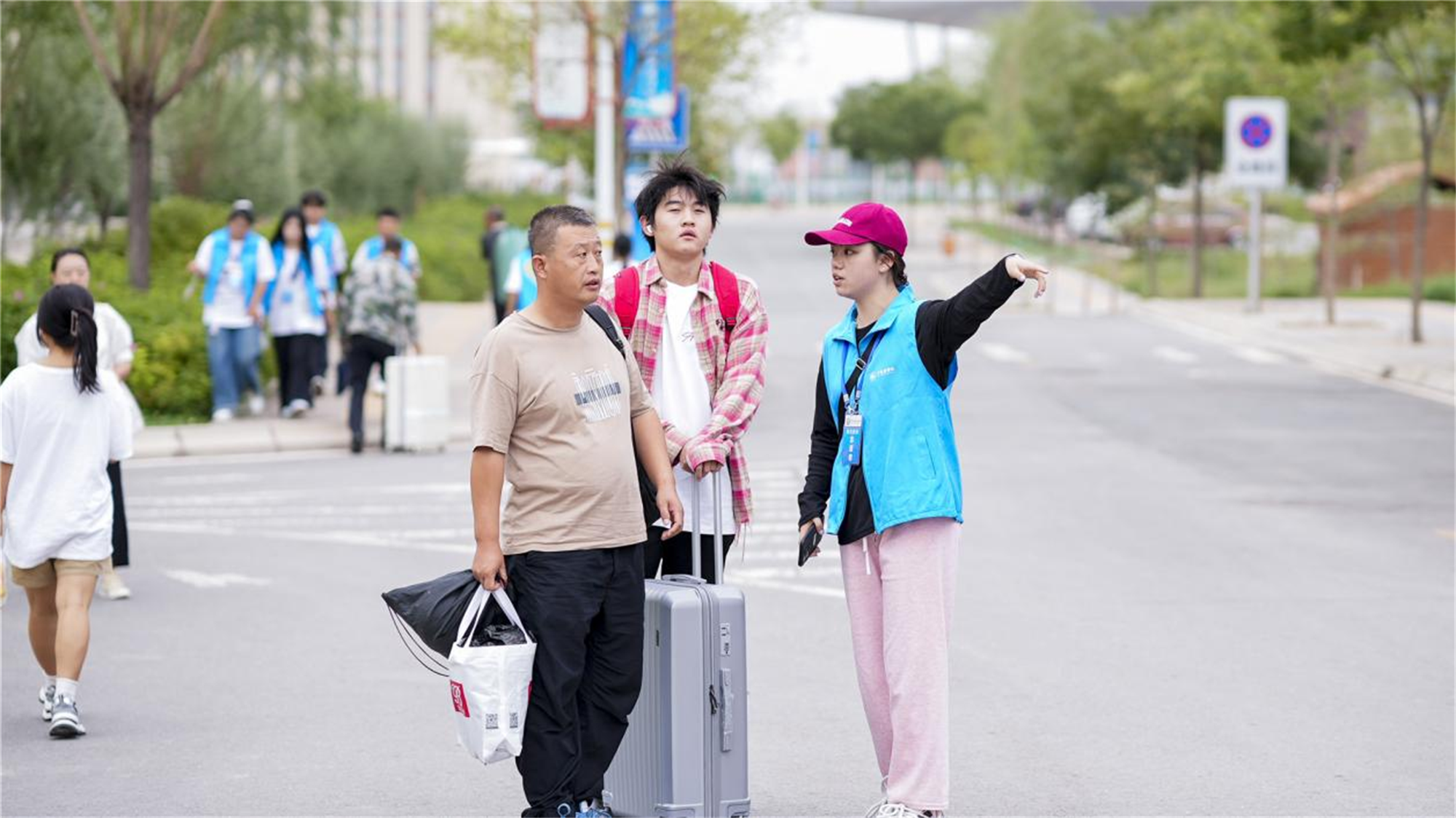 在学校统筹部署下,各部门、二级学院群策群力、通力合作,用心用情地做好各项服务,全力营造舒心、暖心、热心、便捷的报到环境,确保新生报到安全有序进行。全校师生以饱满昂扬的风貌积极参与到迎新工作中,迎接来自五湖四海的莘莘学子。由团委及学生会干部、志愿者协会组成的迎新志愿者团队穿梭在各个点位,行李转运、报到指引、校园讲解,为每一个抵校学生热情引导、耐心讲解、帮提行李,用热情与笑容为大家提供服务,新媒体中心的同学们用相机记录迎新美好瞬间,帮助新生们留下美好的回忆,黄色、蓝色、黑色马甲成了迎新现场一道亮丽的风景线。