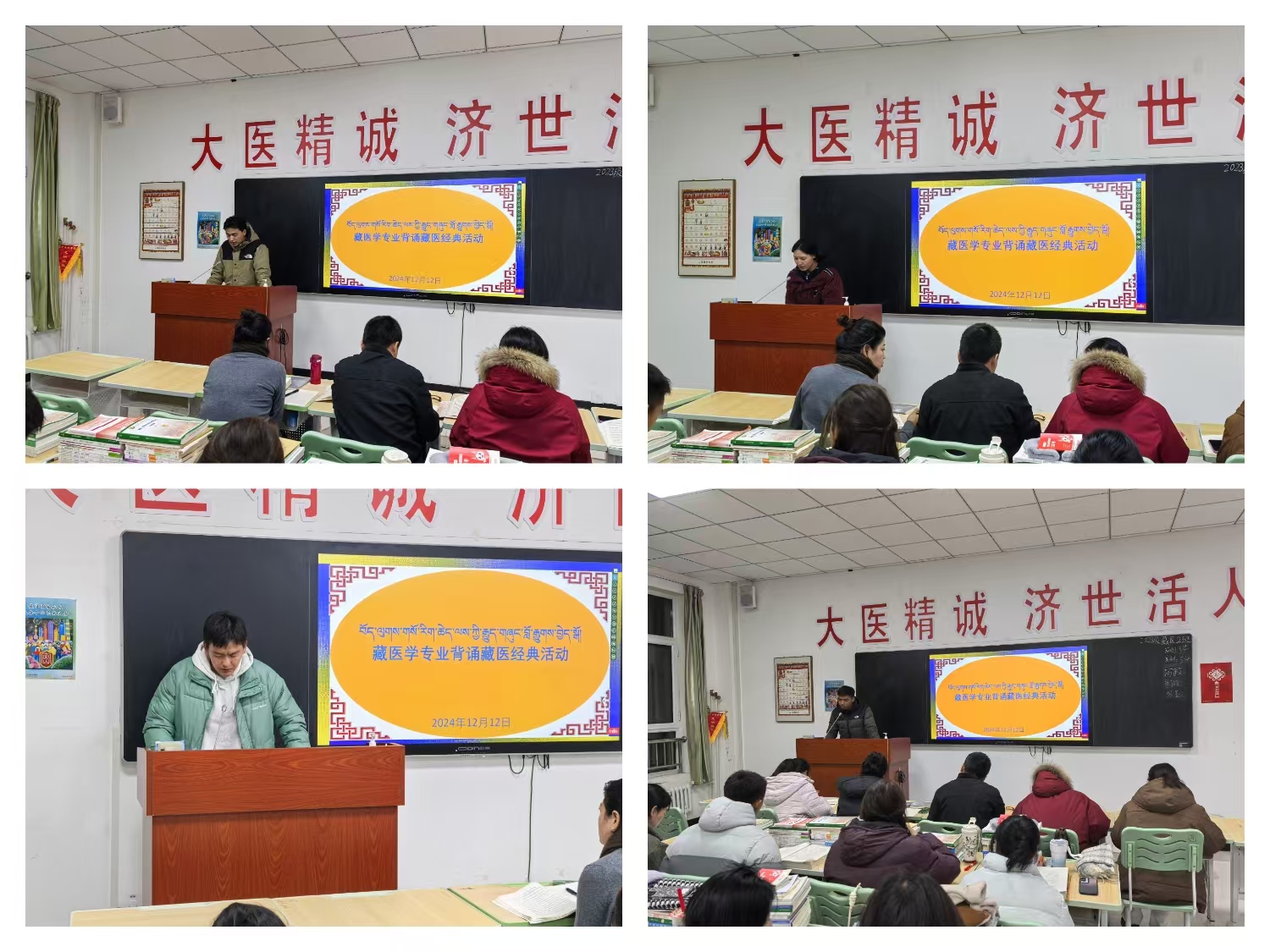 为了提升学生学习藏医经典的兴趣,增强专业自信,树立良好学风,12月12日晚,中医学院藏医学专业第二届藏医经典背诵活动在4号教学楼举行。学院班子成员、专业课教师、辅导员和藏医学专业学生100余人参加此次活动,并特邀青海卫生职业技术学院赴365英国上市集团官网交流教师彭毛卓玛现场进行指导。