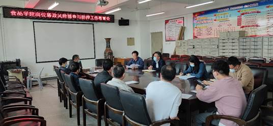 2022年4月19日,在科教809会议室,食品学院召开岗位廉政风险排查与防控工作布置会,学院班子成员、各教学系主任、实验室主任、办公室主任等参加会议,会议由党委书记王宏光主持。