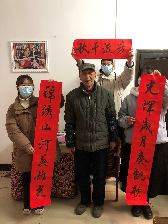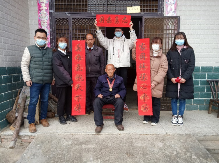 实践团队严格遵守当地疫情防控的规定,在麻城市老干局、党史办、乘马岗镇政府的协助下,先后看望慰问了抗战老兵龚敬堂、江乐修、抗美援朝老兵丁永念、离休退役干部卢则喜、邢元三、孙洪禄等。食品学院的教师与学生代表将一幅幅带着浓浓年味的对联交到了每一位老兵的手上,在新春佳节来临之际为他们送上了新年最真挚的问候。这一幅幅春联不仅营造了新春佳节的节日气氛,更表达了莘莘学子对老兵的敬仰与尊重。93岁高龄的退役老兵邢元三激动地表示,感谢党和各位师生对老兵的关爱,让我们在寒冷的冬天感受到了春一般的温暖。