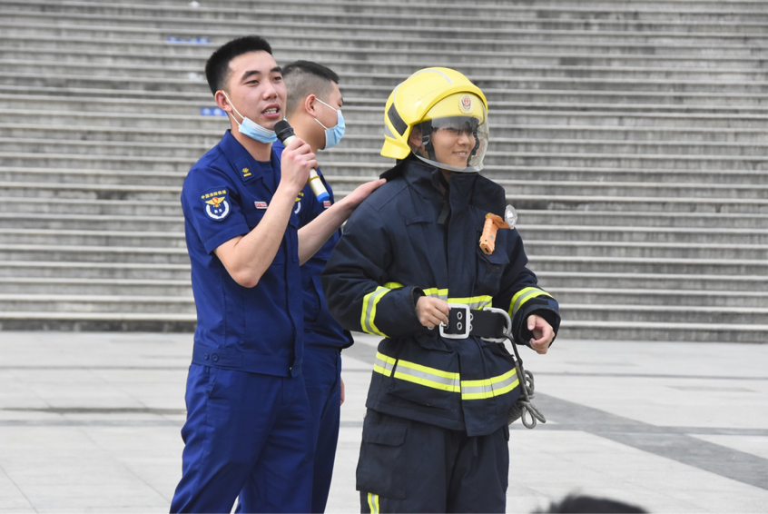 会上,陈汉想给同学们介绍了消防“四懂四会”的具体内容,他希望通过此次活动,让在校师生掌握消防基础知识,在遇到火灾的情况下,能够自救逃生。随后,聂俊豪教官为大家讲解了如何正确逃生,为接下来的消防演练提供充分的理论知识。一声“撤离”令下,消防演习迅速地开展起来,全体人员在指挥下进入紧急疏散状态:同学们用湿毛巾捂着口鼻有序撤离,按照逃生路线撤离到广场上。