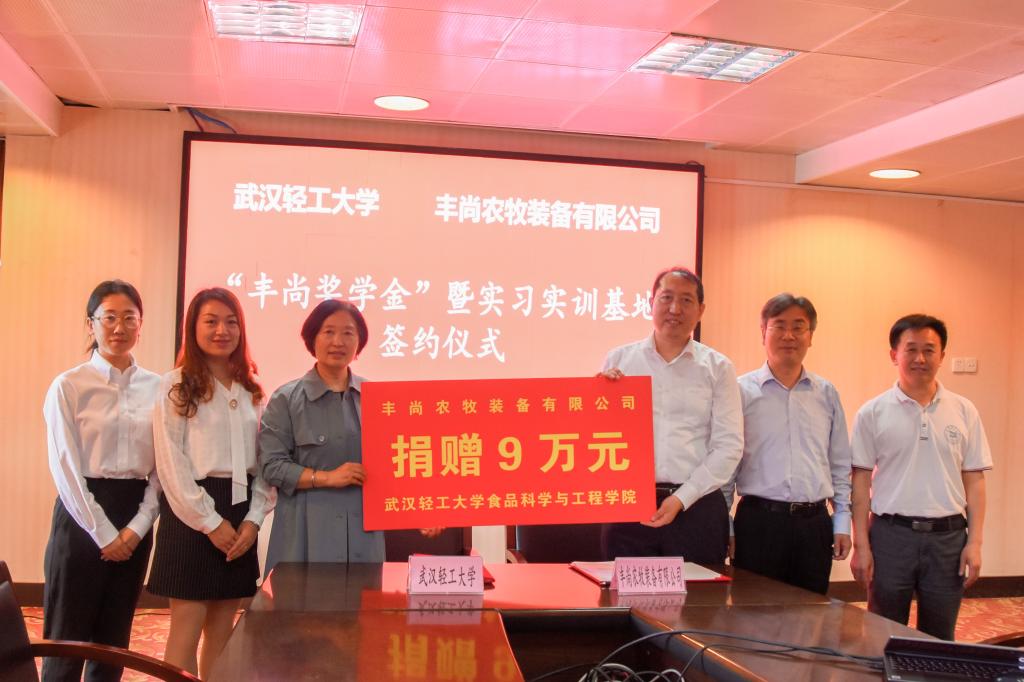 2021年5月20日,武汉轻工大学“丰尚奖学金”暨实习实训基地签约仪式在食品科技楼二楼会议室圆满召开。丰尚农牧装备有限公司副总裁李向东、组织与人才发展经理葛凤洁、招聘经理赵世萍、我校校友办主任滕红华、食品学院党委书记王宏光、院长丁文平及辅导员牟星共同出席了本次活动。