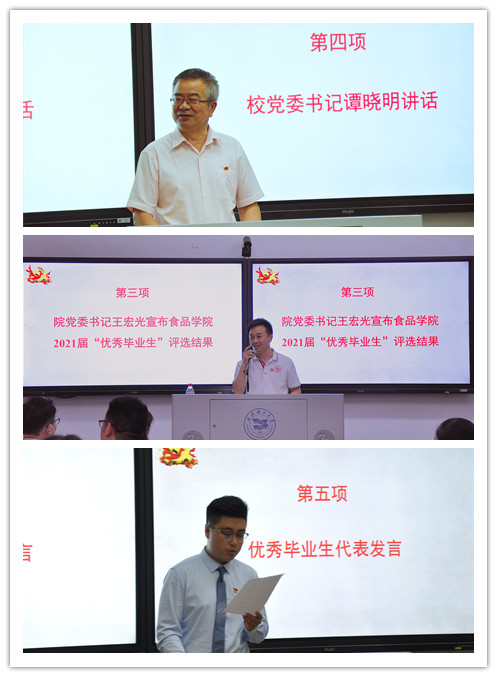 王宏光宣布食品学院2021届“优秀毕业研究生”评选名单。他指出,获评的11位同学中,有8位是党员,有3位是入党积极分子,充分体现了研究生党支部的先锋引领作用。他希望研究生继续秉承和弘扬“志存高远,勇夺第一”的食品精神,不负青春,不负韶华,以优异的成绩,为时代交上一份满意的答卷。