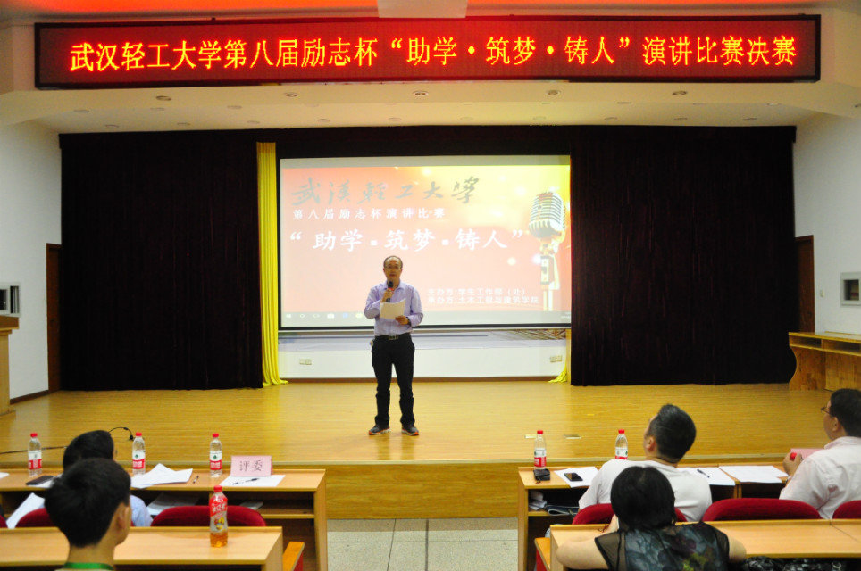 本报讯(食品学院 王娴)为激励学生在追求自己梦想的道路上不懈努力,奋力拼搏,懂得感恩与回报。2018年5月22日晚6:30,武汉轻工大学第八届励志杯“助学·筑梦·铸人”演讲比赛决赛于常青科学报告厅展开,莅临本次活动的嘉宾有马克思主义学院副教授、中国近现代纲要教研室主任杨华祥老师,党委统战部部长李斌斌老师,学工部部长李世峰老师、学生工作部副部长李辉老师,校团委书记刘竞老师及党委宣传部刘义老师。
