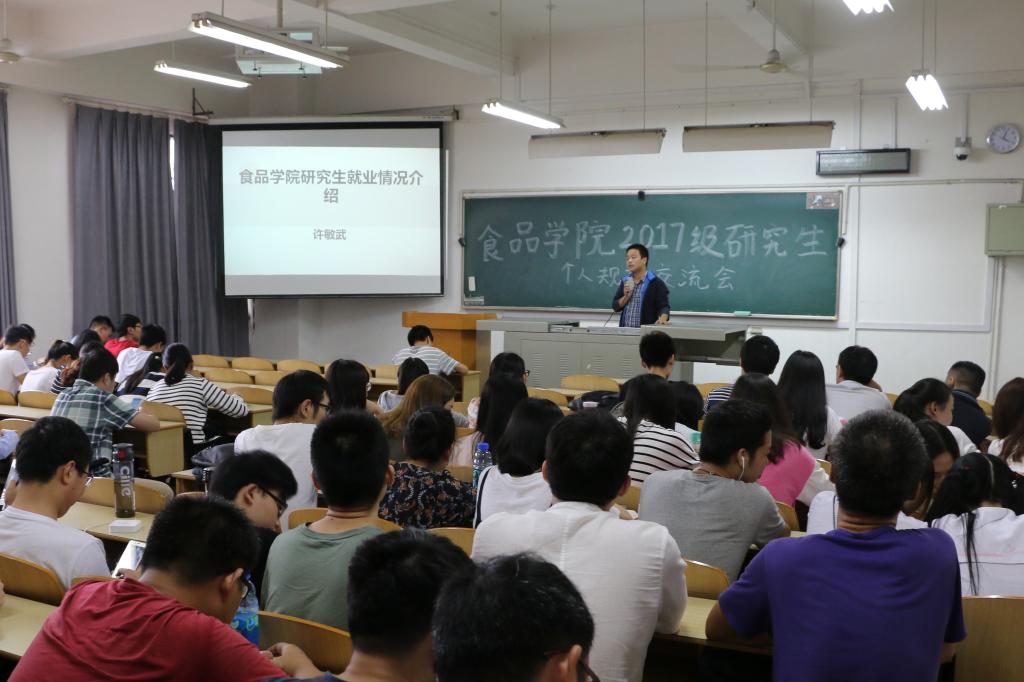 本报讯(食品学院 曹健)为使研究生新生能够更好更快地适应研究生生活,帮助他们减轻初入校门的困惑和迷茫,使他们能在学习、生活和工作等方面做好生涯规划,少走弯路,9月21日下午4点,由我校食品学院举办的2017级研究生个人规划交流会在科教楼207教室顺利举办。食品学院研究生辅导员许敏武老师与全体2017级研究生参加了本次交流会。