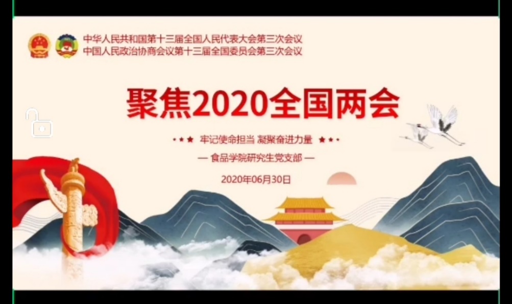 在中国共产党建党99周年之际,为贯彻落实学校在各基层组织开展党建“四个一”活动的通知精神,进一步加强党员同志的责任意识和担当意识。6月30日晚上七点,食品学院研究生党支部通过腾讯会议开展了支部主题党日活动,支部全体党员就2020年全国两会相关精神及中国共产党建党以来光辉历程展开了学习。7月1日上午九点,支部全体党员还收看了高校党组织战“疫”示范微党课“七一”专题。
