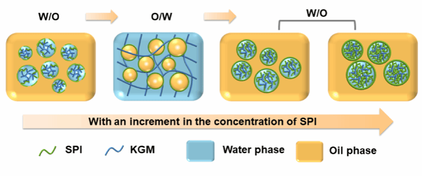 soy protein isolate (SPI) to konjac glucomannan (KGM) was designed to fabricate bigels with ethyl cellulose (EC) oleogel at a fixed mass ratio of oleogel to hydrogel (OG:HG), and the phase inversion was subsequently achieved by increasing the concentration of SPI in the binary hydrogel, resulting in a transition from W/O to O/W bigels and then back to W/O bigels. Specifically, when the binary hydrogel contained 1 wt% SPI and 0.5 wt% KGM, the bigel type was O/W. A KGM network existed between the oil droplets of O/W bigels and within the internal phase of W/O bigels, with SPI being adsorbed at the oil-water interfaces of the bigels. As the concentration of SPI increased, the oil-water interfaces became progressively populated with proteins, leading to an increment in droplet diameter and a reduction in hardness, as well as an elevation of free water content within the bigels. This study proposes a novel operational strategy for controlling the phase inversion of bigels and developing encapsulation delivery systems by adjusting the concentration of SPI in binary hydrogels.