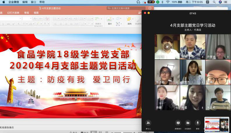 在我国第32个爱国卫生月到来之际,为深入贯彻落实习近平总书记系列重要讲话精神,巩固疫情防控工作成果,响应党中央大力开展爱国卫生运动的号召,食品学院18级学生党支部于 4月21日晚6点通过网络平台开展了主题为“防疫有我,爱卫同行”的线上支部主题党日活动。