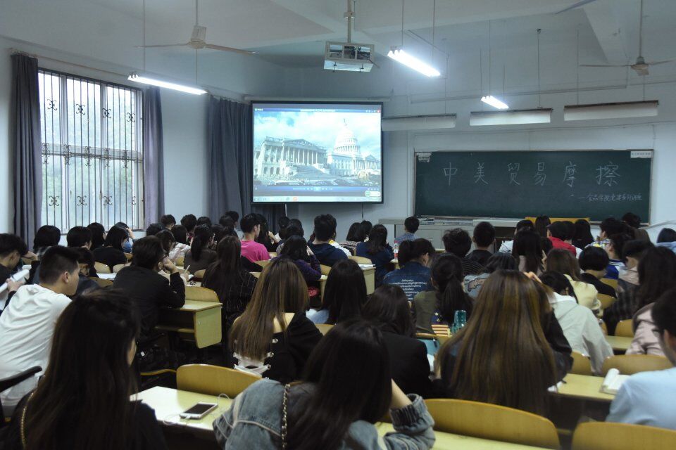 讲座上,主持人简单介绍了本次活动的目的以及中美贸易摩擦的背景。党员发展服务中心的张爱华同学就自己对于中美贸易摩擦的多角度分析进行发言,他说:“中国一直是一个爱好和平的国家,中方不挑起也不愿意去打贸易战,但是我们也不怕打贸易战。”分析了中国对此次贸易战的态度。同时,他也对“身为青年的我们应如何做一名有担当的中国人”提出了自己的想法,并表示:“我们大学生只有树立了正确的观念态度,才能成为中美贸易摩擦的中流砥柱。”
