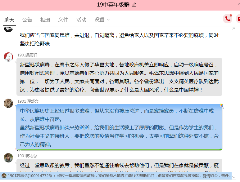 在年级会议中,张老师组织全体同学一同观看疫情防控思政大课。并进行了积极的互动和分享讨论。在同学们的激烈讨论中可以看到几个关键词: “爱国”和“责任”。同学们谈到:“这一场疫情防控保卫战,正是因为全国人民团结一心共同对抗疫情,一方有难八方支援,各尽其责保卫国家,作出自己的贡献,才会取得顺利进展”,“天下兴亡,匹夫有责。要清楚的明白责任从来不是一个甜美的字眼,不能拿别人的“负重前行”,为自己的“岁月静好”买单”。最后辅导员张子涵老师鼓励同学们增强向模范学习的意识,勇于肩负起时代赋予的使命与责任,与祖国同命运。从我做起,珍惜时间,脚踏实地,尽快适应新的网络教学新模式,在家也要自主高效的学习。