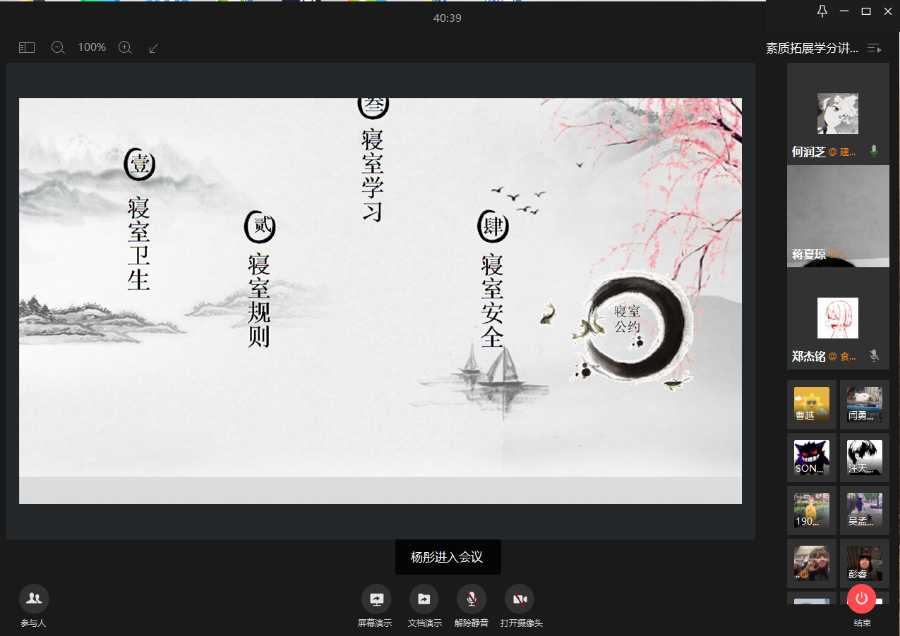 郭晨怡同学结合PPT详细讲解了大学生综合素质拓展学分的构成、建立台账的目的、申报学分的前期准备、中期开展及后期审核等各个环节。随后贺荣燊和何润芝为大家介绍了寝室文化建设和寝室素养培养方面的经验,还跟19级的同学们讲述了寝室学习氛围的营造、寝室公约制定、寝室卫生维护和寝室用电安全等方面的重点内容。