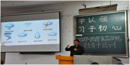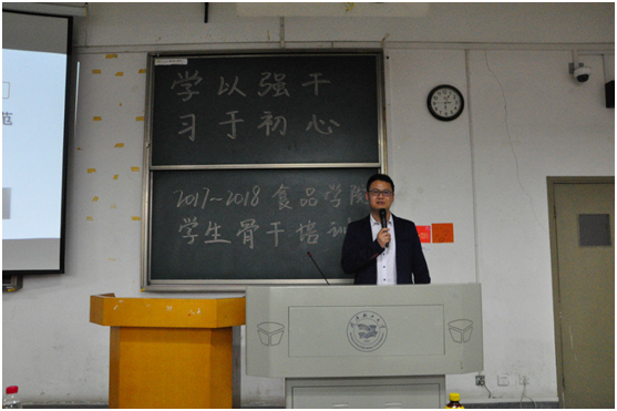 本报讯(食品学院 刘秋蝶 摄影 贺芷菲 王晨泰)食品学院为提高学生干部的理论学习水平以及工作素养,于2018年3月29日和30日下午在科教201举办了“学以强干,习以初心”骨干培训大会,出席本次活动的嘉宾有校团委书记刘竞、食品学院分党委书记王宏光、校团委田兴恒老师、食品学院分团委书记罗霄、礼仪老师郭彦希以及学生骨干两百余人。