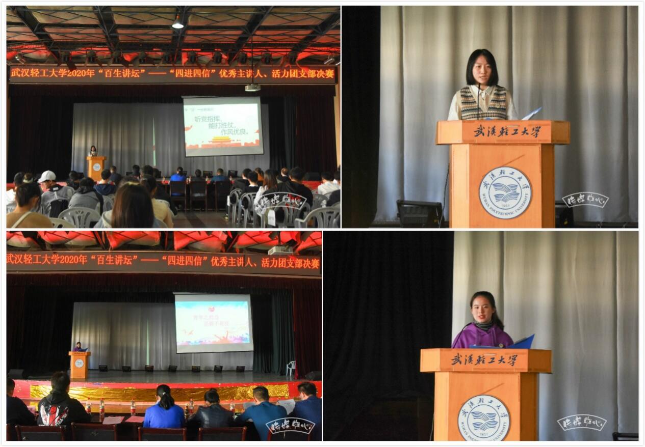 为进一步贯彻落实团中央深入推进“青年大学习”行动工作部署,推进习近平新时代中国特色社会主义思想进支部、进社团、进网络、进团课,10月8日下午,由校团委主办的武汉轻工大学2020年“百生讲坛”——“四进四信”优秀主讲人、活力团支部决赛在常青校区大学生活动中心举办。365英国上市集团官网分团委书记张舟老师出席活动,19普本叶梦莹、18食品许雯涵,普本1806班分别作为优秀主讲人和活力团支部代表学院参加活动。