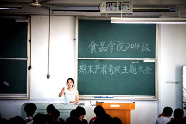 本报讯 (食品学院 李姝含 摄影:周勇俊)为了端正考风,严肃考纪,进一步增强同学们的安全意识,使广大学生度过一个安全、愉快的假期,食品学院2014级辅导员牟星老师召开了期末考风考纪主题大会。大会于6月22日下午3点在科教举行,食品学院2014级的全体同学参加了此次会议。