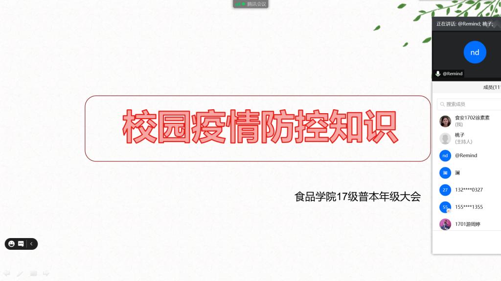 会议伊始,阮老师为同学们讲解了疫情防控相关知识,从校园公共卫生管理延伸到个人卫生管理。在开学前,学校各方面都做了充足的准备工作来迎接同学们返校。校领导积极筹备,全体教师共同努力,开学伊始我校坚持做到早部署、细安排、快行动,确保开学工作有序、平稳开展。开学之后,同学们更要注重个人的卫生管理。开学后的一切行动要配合学院工作,做好个人卫生防护,佩戴好口罩,不聚集不窜门。