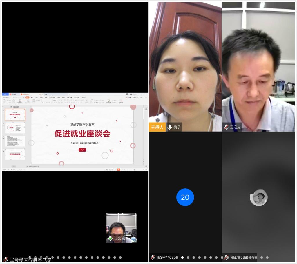为进一步激发学生的就业意识、拓宽就业思路、提升就业能力,加强对食品17级普本学生就业相关的指导与帮助。由17级食品普本辅导员阮秀娟老师牵头,17级食品普本全体就业学生参加的促进就业座谈会,于2020年7月22日19:30在腾讯会议成功举办。本次促进就业座谈会邀请到食品学院党委书记王宏光老师来为大家指导点评、答疑解惑。