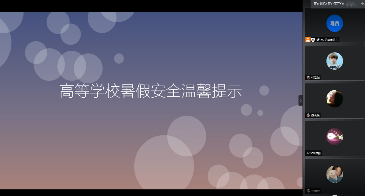 会议第一项张老师详细解读了《高等学校暑假安全责任书和温馨提示》,强调假期期间的安全注意事项,暑假是安全事故的多发期,切实注意交通安全,不得到江河、湖泊等危险水域游泳,谨防溺水事件的发生。警惕网络、金融诈骗,保护好个人信息。外出实习或兼职时务必要告知家长,保护好个人的人身财产安全。另外要坚持落实好每日的健康日报,配合做好疫情防控的相关工作。