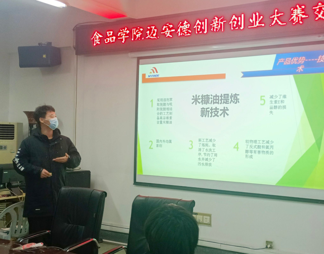 主持宣布交流培训会正式开始,六支第二届的优秀队伍分别对产品概述、项目计划书进行了简要的介绍。首先汇报的项目是“富硒橘桂花葛根茶”,团队成员分别从产品介绍、技术研发、营销策略、公司介绍等四个方面分享了葛根和硒元素的好处,介绍了葛根茶的受欢迎程度以及市场的广阔应用前景。第二组项目成员“高谷维素米糠油”分别从市场分析、产品优势、公司发展等三个方面介绍,分析了米糠油与普通油脂的区别以及广阔的市场应用前景。第三组项目“油茶籽油”从项目概况、市场分析、产品介绍、发展战略四个方面进行介绍,对市场进行了具体分析,陈述产品的营养以及功能成分。