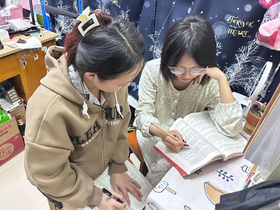 “两人每天迎着清晨的朝阳携手踏进图书馆,在图书馆、食堂和宿舍三点一线、早出晚归,当她们在复习过程中遇到难题而变得心浮气躁时会互相提醒,也会在枯燥的复习过程中分享彼此解压方式。”回想起考研过程中的点点滴滴,她们笑着讲述起一段段难忘的回忆。