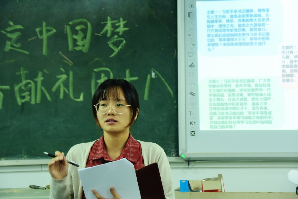 此次活动围绕着习近平总书记的谆谆教诲展开。活动首先播放了一个视频,为我们介绍习总书记对新青年提出的更高要求和殷切期望。紧接着由分团委组织部副部长尤心萌为我们讲解十八大基本知识,以幽默的问答形式强调了党的四项原则等内容。然后大家一起观看视频,生动形象地展示出“绿水青山就是金山银山”,“一带一路”和“四有军人”这三个关键词的具体内容。随后,参加学习的同学们分小组进行讨论,并由代表总结发言。正如习近平总书记提到“青年的价值取向决定了未来整个社会的价值取向”,青年必须有优良的品德、丰富的知识、过硬的本领,才能担负起历史的重托。最后食品学院分团委副书记何婉莹总结发言,她认为大学生活不仅需要物质上的充实,更需要在精神上武装自己,明确的目标,不懈奋斗。